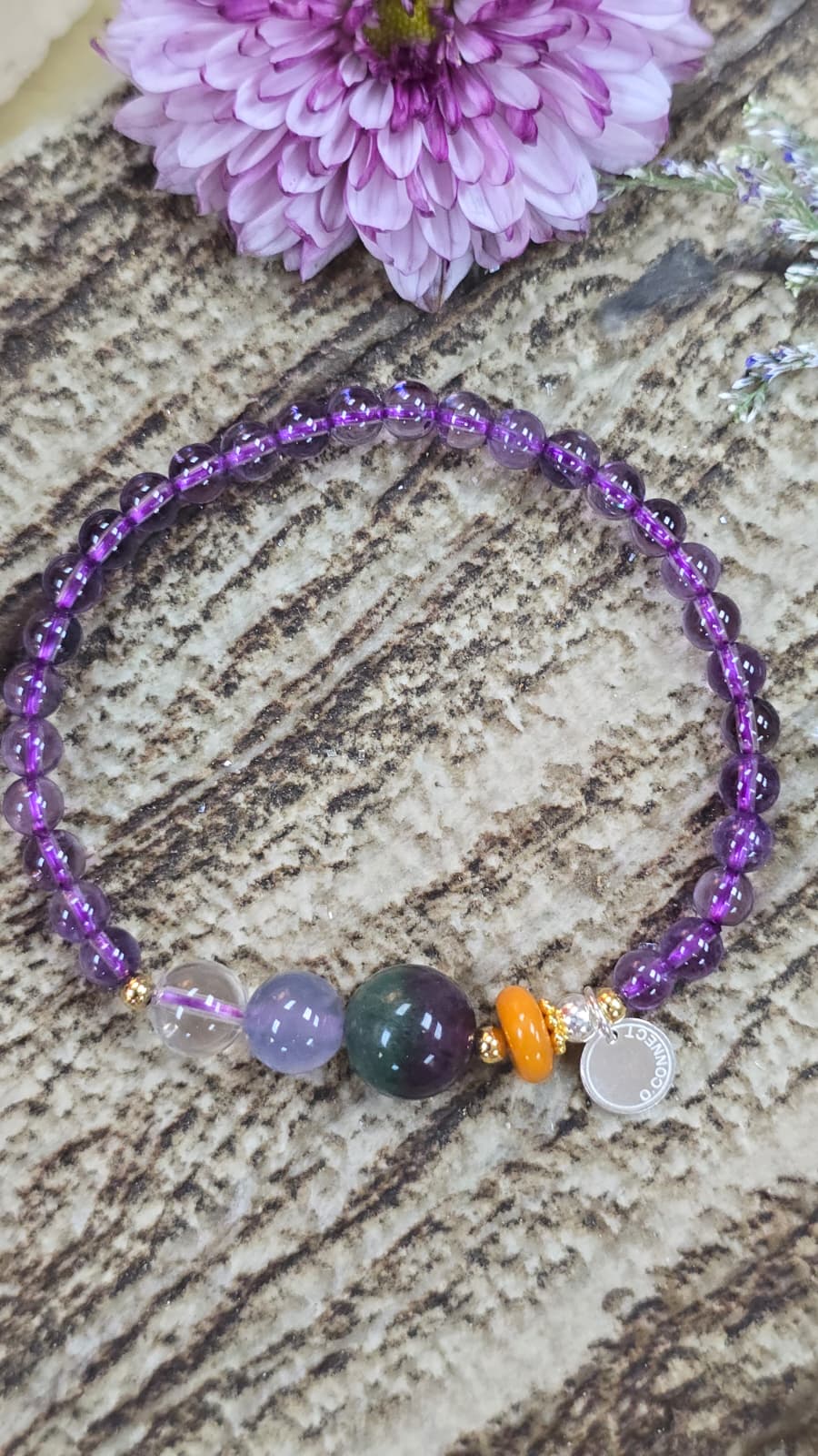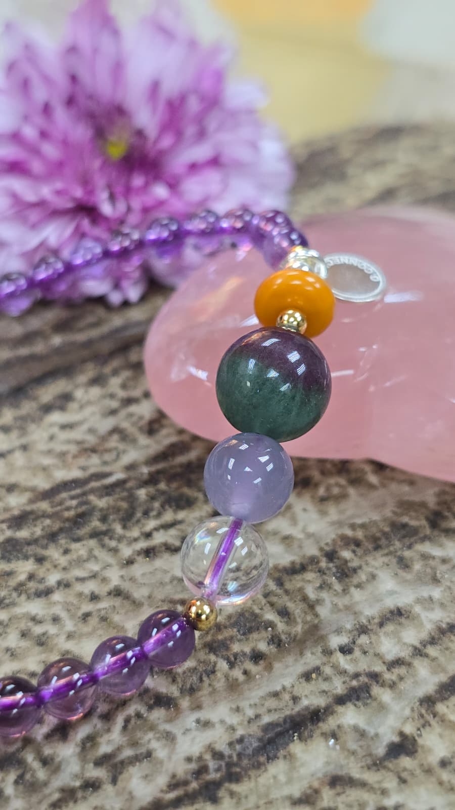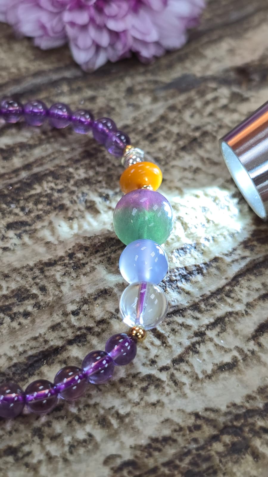 美美的鍍金925純銀珠, 近乎全清的喜馬拉雅山白晶, 超級滋養的藍玉髓, 雙重顏色的西瓜螢石, 保平安的蜜蠟珠片.