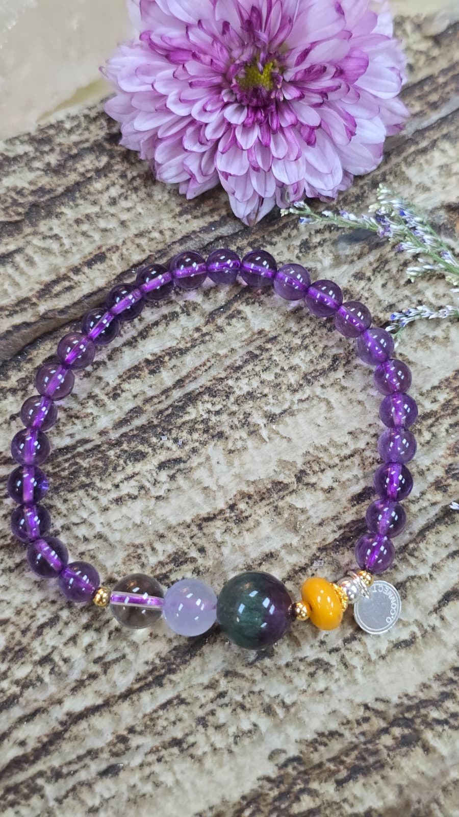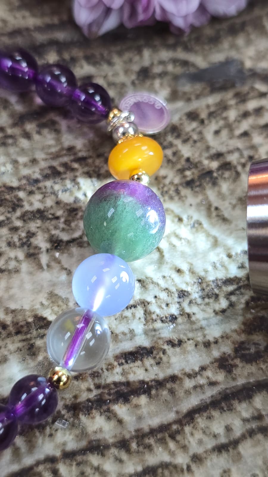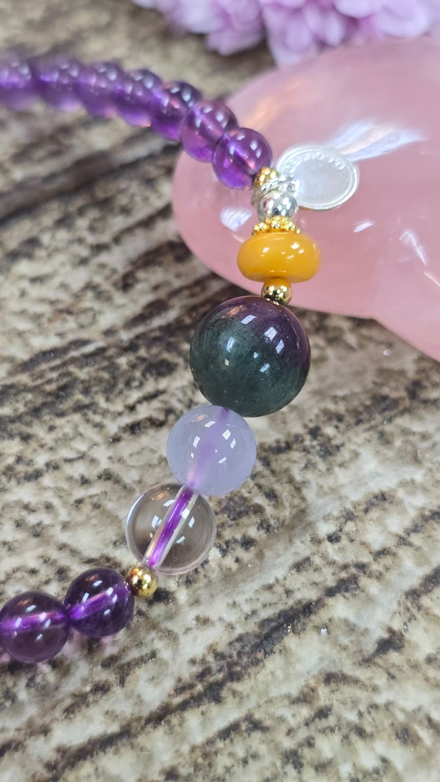 美美的鍍金925純銀珠, 近乎全清的喜馬拉雅山白晶, 超級滋養的藍玉髓, 雙重顏色的西瓜螢石, 保平安的蜜蠟珠片.
